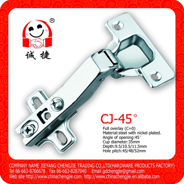產(chǎn)品描述: 開門角度:45° 鉸杯尺寸:35mm 鉸杯深度:9.5/10.5/11.5mm 鉸杯孔距:45/48/52mm 適用門板厚度:14-24mm 門板K距離:3-7mm 性能:深度調(diào)節(jié)±2毫米 高度調(diào)節(jié)±2毫米 蓋門調(diào)節(jié)±4毫米 包裝細(xì)節(jié): 1)散裝:200只/箱,250只/箱,300只/箱 2)只含螺絲/袋裝,100只/箱 3)彩盒包裝/根據(jù)客戶需求 產(chǎn)品單價,具體信息,歡迎隨時咨詢我們!